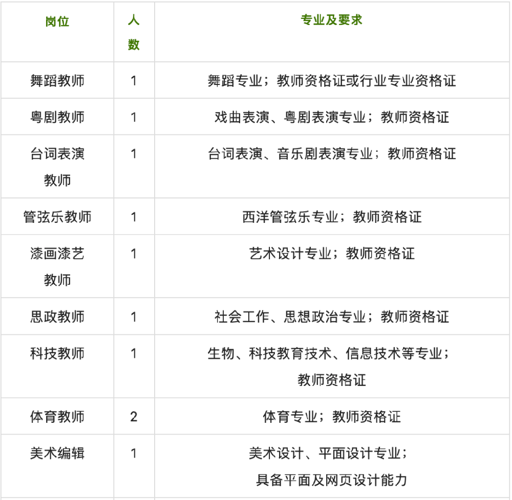 2022年第四批专任教师及教辅人员招聘公告是一所隶属广东省教育厅的公办全日制高职院校。学校是农业农村部、教育部乡村振兴人才培养优质校、广东省示范性高等职业院校、广东省大学生创新创业教育示范学校;是教育部第三批现代学徒制试点单位,教育部1+X证书制度试点单位,农业部首批全国新型职业农民培育示范基地,科技部第二批国家级“星创天地”项目单位;广东省职业院校“双师型”教师培训基地,广东省“粤菜师傅”培训基地项目单位。为了适应学校办学规模扩大和事业发展需要,现面向社会公开招聘专任教师及教辅人员19名。现将有关事项公告如下: